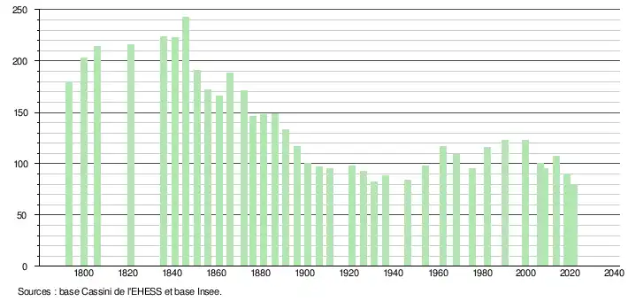 L'évolution du nombre d'habitants est connue à travers les recensements de la population effectués dans la commune depuis 1793. Pour les communes de moins de 10 000 habitants, une enquête de recensement portant sur toute la population est réalisée tous les cinq ans, les populations légales des années intermédiaires étant quant à elles estimées par interpolation ou extrapolation[14]. Pour la commune, le premier recensement exhaustif entrant dans le cadre du nouveau dispositif a été réalisé en 2008[15].
