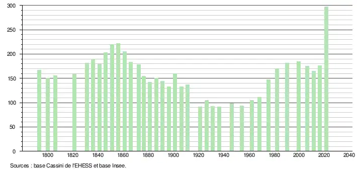 L'évolution du nombre d'habitants est connue à travers les recensements de la population effectués dans la commune depuis 1793. Pour les communes de moins de 10 000 habitants, une enquête de recensement portant sur toute la population est réalisée tous les cinq ans, les populations légales des années intermédiaires étant quant à elles estimées par interpolation ou extrapolation[18]. Pour la commune, le premier recensement exhaustif entrant dans le cadre du nouveau dispositif a été réalisé en 2006[19].