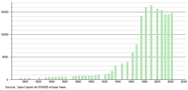 - Par convention dans Wikipédia, le principe a été retenu de n’afficher dans le tableau des recensements et le graphique, pour les populations légales postérieures à 1999, que les populations correspondant à une enquête exhaustive de recensement pour les communes de moins de 10 000 habitants, et que les populations des années 2006, 2011, 2016, etc. pour les communes de plus de 10 000 habitants, ainsi que la dernière population légale publiée par l’Insee pour l'ensemble des communes.