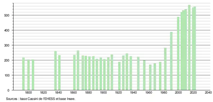 L'évolution du nombre d'habitants est connue à travers les recensements de la population effectués dans la commune depuis 1793. Pour les communes de moins de 10 000 habitants, une enquête de recensement portant sur toute la population est réalisée tous les cinq ans, les populations légales des années intermédiaires étant quant à elles estimées par interpolation ou extrapolation[17]. Pour la commune, le premier recensement exhaustif entrant dans le cadre du nouveau dispositif a été réalisé en 2004[18].