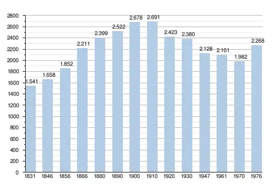 Les chiffres des années 1831 à 1970 tiennent compte des chiffres des anciennes communes fusionnées.