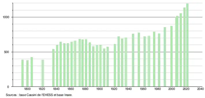 L'évolution du nombre d'habitants est connue à travers les recensements de la population effectués dans la commune depuis 1793. Pour les communes de moins de 10 000 habitants, une enquête de recensement portant sur toute la population est réalisée tous les cinq ans, les populations légales des années intermédiaires étant quant à elles estimées par interpolation ou extrapolation[13]. Pour la commune, le premier recensement exhaustif entrant dans le cadre du nouveau dispositif a été réalisé en 2007[14].