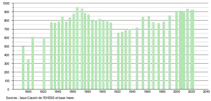 L'évolution du nombre d'habitants est connue à travers les recensements de la population effectués dans la commune depuis 1793. Pour les communes de moins de 10 000 habitants, une enquête de recensement portant sur toute la population est réalisée tous les cinq ans, les populations légales des années intermédiaires étant quant à elles estimées par interpolation ou extrapolation[28]. Pour la commune, le premier recensement exhaustif entrant dans le cadre du nouveau dispositif a été réalisé en 2004[29].