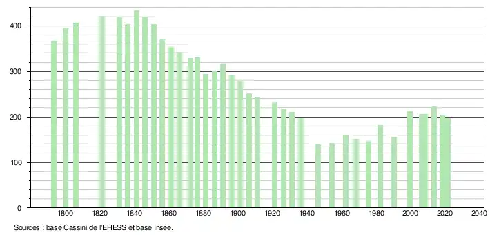 L'évolution du nombre d'habitants est connue à travers les recensements de la population effectués dans la commune depuis 1793. Pour les communes de moins de 10 000 habitants, une enquête de recensement portant sur toute la population est réalisée tous les cinq ans, les populations légales des années intermédiaires étant quant à elles estimées par interpolation ou extrapolation[18]. Pour la commune, le premier recensement exhaustif entrant dans le cadre du nouveau dispositif a été réalisé en 2008[19].