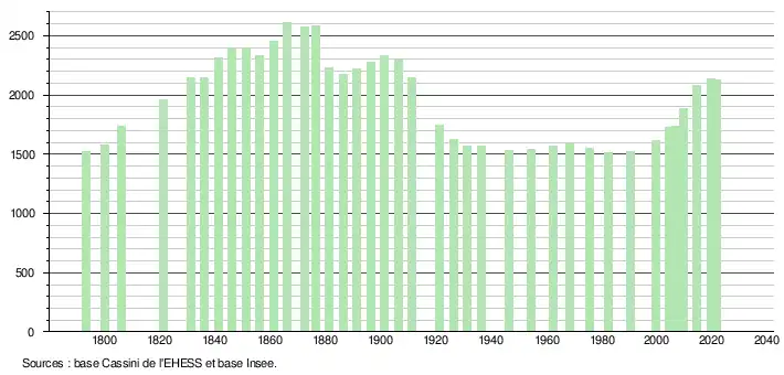 L'évolution du nombre d'habitants est connue à travers les recensements de la population effectués dans la commune depuis 1793. Pour les communes de moins de 10 000 habitants, une enquête de recensement portant sur toute la population est réalisée tous les cinq ans, les populations légales des années intermédiaires étant quant à elles estimées par interpolation ou extrapolation[13]. Pour la commune, le premier recensement exhaustif entrant dans le cadre du nouveau dispositif a été réalisé en 2004[14].