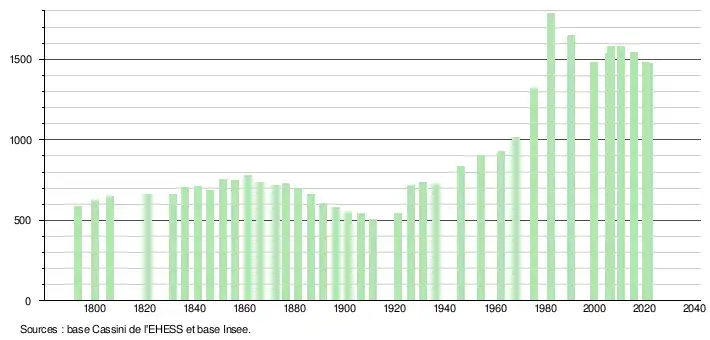 L'évolution du nombre d'habitants est connue à travers les recensements de la population effectués dans la commune depuis 1793. Pour les communes de moins de 10 000 habitants, une enquête de recensement portant sur toute la population est réalisée tous les cinq ans, les populations légales des années intermédiaires étant quant à elles estimées par interpolation ou extrapolation[14]. Pour la commune, le premier recensement exhaustif entrant dans le cadre du nouveau dispositif a été réalisé en 2005[15].