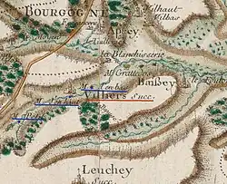 La carte de Cassini ci-dessus montre qu'au XVIIIè siècle, Villiers-lès-Aprey est une paroisse située sur la rive gauche du ruisseau d'Aujeurres.