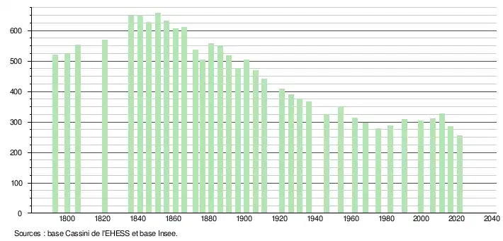 L'évolution du nombre d'habitants est connue à travers les recensements de la population effectués dans la commune depuis 1793. Pour les communes de moins de 10 000 habitants, une enquête de recensement portant sur toute la population est réalisée tous les cinq ans, les populations légales des années intermédiaires étant quant à elles estimées par interpolation ou extrapolation[20]. Pour la commune, le premier recensement exhaustif entrant dans le cadre du nouveau dispositif a été réalisé en 2006[21].