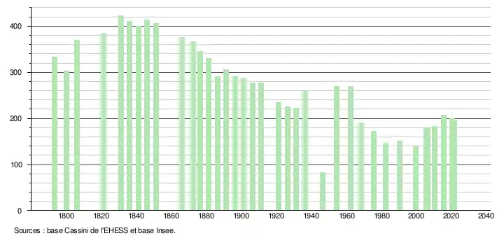 L'évolution du nombre d'habitants est connue à travers les recensements de la population effectués dans la commune depuis 1793. Pour les communes de moins de 10 000 habitants, une enquête de recensement portant sur toute la population est réalisée tous les cinq ans, les populations légales des années intermédiaires étant quant à elles estimées par interpolation ou extrapolation[21]. Pour la commune, le premier recensement exhaustif entrant dans le cadre du nouveau dispositif a été réalisé en 2005[22].