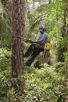 - Couper, en haut de l'arbre, une partie de la spathe (pièce florale en forme de feuille), puis à pratiquer des incisions horizontales sur la tige de la spadice, le bourgeon terminal (une inflorescence en forme d'épi), d'où la sève s'écoule vers un entonnoir en feuilles de palmier, qui fait couler la sève dans une bouteille. Plusieurs fois par jour l’entaille est rouverte pour ne pas bloquer le flux de sève; un arbre peut produire plusieurs litres par jour. Cette technique permet une récolte pendant un mois, mais c'est une activité qui présente un risque car elle oblige à monter plusieurs fois par jour en haut des palmiers et les chutes ne sont pas rares (souvent par manque de mesure de sécurité élémentaire). Un arbre ainsi traité ne fera pas de fruit pendant la saison[3].