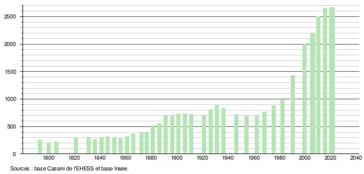 L'évolution du nombre d'habitants est connue à travers les recensements de la population effectués dans la commune depuis 1793. Pour les communes de moins de 10 000 habitants, une enquête de recensement portant sur toute la population est réalisée tous les cinq ans, les populations légales des années intermédiaires étant quant à elles estimées par interpolation ou extrapolation[34]. Pour la commune, le premier recensement exhaustif entrant dans le cadre du nouveau dispositif a été réalisé en 2005[35].