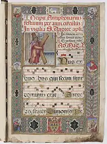 - Antiphonaire et graduel destiné à l'église Saint-Jacques des Espagnols à Rome, sur commande de Charles Quint, Bibliothèque nationale d'Espagne, Vitr.16.1[19]