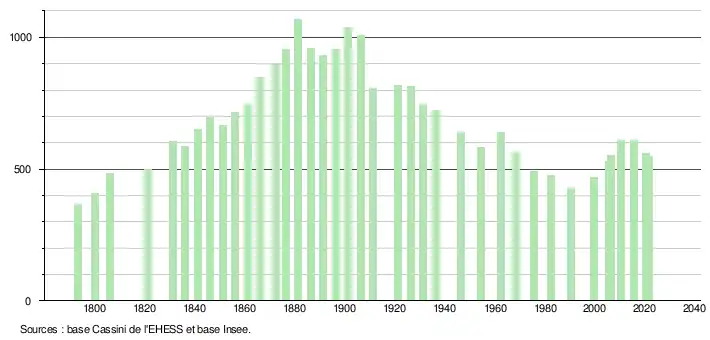 L'évolution du nombre d'habitants est connue à travers les recensements de la population effectués dans la commune depuis 1793. Pour les communes de moins de 10 000 habitants, une enquête de recensement portant sur toute la population est réalisée tous les cinq ans, les populations légales des années intermédiaires étant quant à elles estimées par interpolation ou extrapolation[44]. Pour la commune, le premier recensement exhaustif entrant dans le cadre du nouveau dispositif a été réalisé en 2005[45].
