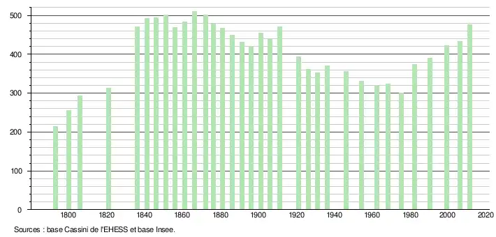 - Dans le tableau des recensements et le graphique, par convention dans Wikipédia, le principe a été retenu, pour les populations légales postérieures à 1999 de n’afficher dans le tableau des recensements et le graphique que les populations correspondant à l'année 2006, première population légale publiée calculée conformément aux concepts définis dans le décret no 2003-485 du 5 juin 2003, et les années correspondant à une enquête exhaustive de recensement pour les communes de moins de 10 000 habitants, ainsi que la dernière population légale publiée par l’Insee.