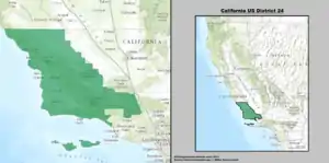 Depuis le redécoupage de 2020, le 24e district congressionnel de Californie est situé à l'extrémité sud de la côte centrale. Il englobe le Comté de Santa Barbara, la majeure partie du Comté de San Luis Obispo et une partie du Comté de Ventura. Le district comprend également six des îles anglo-normandes.