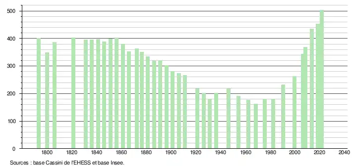 L'évolution du nombre d'habitants est connue à travers les recensements de la population effectués dans la commune depuis 1793. Pour les communes de moins de 10 000 habitants, une enquête de recensement portant sur toute la population est réalisée tous les cinq ans, les populations légales des années intermédiaires étant quant à elles estimées par interpolation ou extrapolation[17]. Pour la commune, le premier recensement exhaustif entrant dans le cadre du nouveau dispositif a été réalisé en 2008[18].