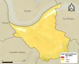 Le retrait-gonflement des sols argileux est susceptible d'engendrer des dommages importants aux bâtiments en cas d’alternance de périodes de sécheresse et de pluie. 95,4 % de la superficie communale est en aléa moyen ou fort (67,7 % au niveau départemental et 48,5 % au niveau national). Sur les 215 bâtiments dénombrés sur la commune en 2019, 198 sont en aléa moyen ou fort, soit 92 %, à comparer aux 72 % au niveau départemental et 54 % au niveau national. Une cartographie de l'exposition du territoire national au retrait gonflement des sols argileux est disponible sur le site du BRGM[23],[Carte 2].