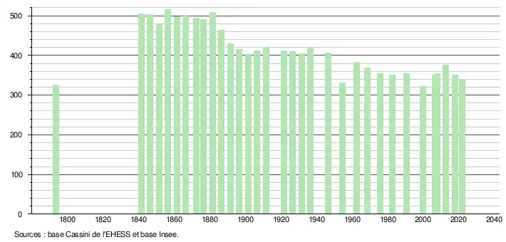 L'évolution du nombre d'habitants est connue à travers les recensements de la population effectués dans la commune depuis 1793. Pour les communes de moins de 10 000 habitants, une enquête de recensement portant sur toute la population est réalisée tous les cinq ans, les populations légales des années intermédiaires étant quant à elles estimées par interpolation ou extrapolation[33]. Pour la commune, le premier recensement exhaustif entrant dans le cadre du nouveau dispositif a été réalisé en 2007[34].