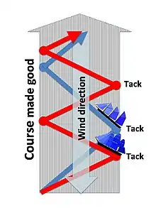 Cette manœuvre est typique d'un voilier cherchant à remonter le vent en effectuant un louvoyage : Ne pouvant pas naviguer face au vent, il enchaîne les virements de bord pour former une trajectoire en zigzag.