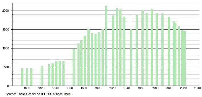 L'évolution du nombre d'habitants est connue à travers les recensements de la population effectués dans la commune depuis 1793. Pour les communes de moins de 10 000 habitants, une enquête de recensement portant sur toute la population est réalisée tous les cinq ans, les populations légales des années intermédiaires étant quant à elles estimées par interpolation ou extrapolation[26]. Pour la commune, le premier recensement exhaustif entrant dans le cadre du nouveau dispositif a été réalisé en 2008[27].