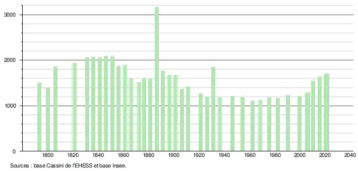 L'évolution du nombre d'habitants est connue à travers les recensements de la population effectués dans la commune depuis 1793. Pour les communes de moins de 10 000 habitants, une enquête de recensement portant sur toute la population est réalisée tous les cinq ans, les populations légales des années intermédiaires étant quant à elles estimées par interpolation ou extrapolation[21]. Pour la commune, le premier recensement exhaustif entrant dans le cadre du nouveau dispositif a été réalisé en 2005[22].