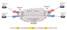 Dans un déploiement type, les routeurs à la clientèle (CE) traitent le routage local de manière traditionnelle et diffusent les informations de routage dans les routeurs d'extrémité (Provider Edge – PE) où les tables de routage sont virtualisées. Le routeur PE encapsule ensuite le trafic avec un label MPLS (le marque pour identifier l'instance VRF du routeur destination) et la transmet à travers le réseau dorsal vers le routeur PE de destination. Le routeur PE de destination décapsule ensuite le trafic et le transmet au routeur CE à destination. Le réseau dorsal est totalement transparent à l'équipement du client, permettant à plusieurs clients ou communautés d'utilisateurs d'utiliser le réseau fédérateur commun tout en assurant la séparation du trafic de bout en bout.