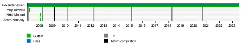 Tandis que basé au New Jersey, le groupe comprend également un deuxième guitariste Philip Altobelli; cependant il part avant l'enregistrement du deuxième EP[3],[18]. Une fois établi au Québec, le groupe s'élargit avec deux nouveaux guitaristes, Nidal Mourad et Adam Kennedy, mais ils partent avant l'enregistrement du troisième EP[4],[15].
