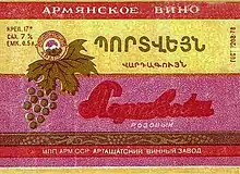 Au XIXe siècle, la production du vin est un des trois piliers de l'agriculture de l'Arménie russe (à côté de la culture des céréales et de l'élevage)[26]. L'industrie vinicole se développe à la fin du siècle, avec notamment la création en 1887 de l'ancêtre de la Yerevan Brandy Company, aujourd'hui plus connue pour son brandy[27]. Cet essor est cependant arrêté net lors de l'occupation turque de 1918 : les vignobles sont arrachés ; l'éphémère Première République d'Arménie tente alors d'encourager la culture de la vigne au moyen de subsides[28].