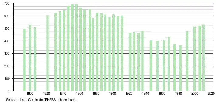 L'évolution du nombre d'habitants est connue à travers les recensements de la population effectués dans la commune depuis 1793. À partir du , les populations légales des communes sont publiées annuellement dans le cadre d'un recensement qui repose désormais sur une collecte d'information annuelle, concernant successivement tous les territoires communaux au cours d'une période de cinq ans. Pour les communes de moins de 10 000 habitants, une enquête de recensement portant sur toute la population est réalisée tous les cinq ans, les populations légales des années intermédiaires étant quant à elles estimées par interpolation ou extrapolation[2]. Pour la commune, le premier recensement exhaustif entrant dans le cadre du nouveau dispositif a été réalisé en [3],[Note 1].