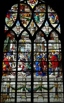 La particularité de la composition de la scène principale de la verrière vient du choix de Jean Chastellain de ne pas placer Salomon au centre de celle-ci. Dans la peinture de la scène, il donne aux personnages des attitudes nobles et souples et des gestes discrets. Ils portent des costumes de brocards damasquinés, de somptueux bijoux, des chapeaux extravagants.