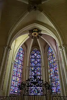 Ces deux premiers panneaux ont été reconstruits par Lorin en 1924, en fonction de la description qu'en avait donné Pintard[1],[6].. Ils s'inspirent pour leur thématique du vitrail de la vie de la Vierge, montrant la scène de sa nativité et celle du premier bain (dans son étage iii).