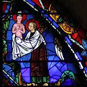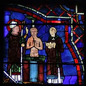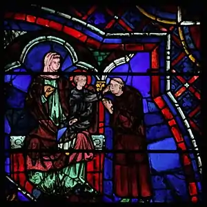 On peut cependant remarquer la grande similitude qu'il y a entre ce panneau et le panneau symétrique du vitrail des saintes Marguerite et Catherine, de l'autre côté de la chapelle : outre que ces deux vitraux présentent les mêmes fonds et les mêmes motifs de bordure dans les panneaux historiés, les deux donateurs sont représentés dans la même attitude de prière devant une vierge à l'enfant, figurant très probablement la statue de Notre-Dame sous terre, statue du XIe siècle brûlée par les vandalismes de 1793[2].