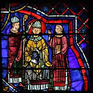 On peut remarquer ici que sa mitre est représentée avec ses deux bandes arrières, les « fanons », figurés ici en vert.