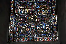 Le vitrail comporte treize médaillons. Il est partagé en deux avec quatre médaillons et au milieu un cinquième en forme de croix. Au-dessus deux médaillons supérieurs concluent le récit. Au milieu en haut, on remarque le Christ bénissant. La lecture des vitraux au Moyen Âge se fait toujours de bas en haut.