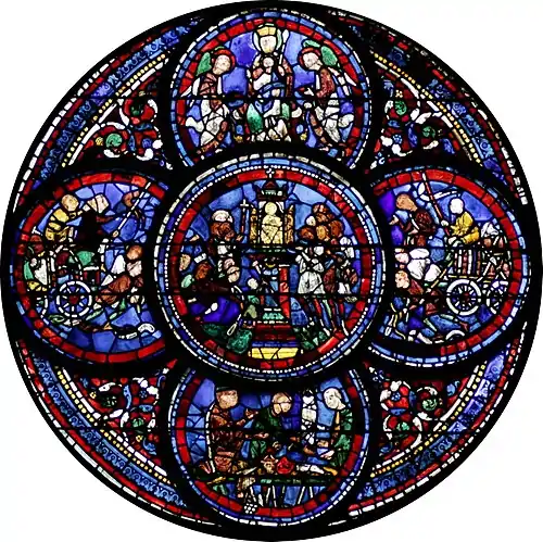 Ce vitrail a été l'un des premiers à traiter le sujet « les miracles de Notre-Dame »[2] C'est une verrière publicitaire montrant le chantier de la construction de la cathédrale Notre-Dame de Chartres, des pèlerins affluant, et les miracles attribués aux reliques qui y étaient l'objet de pèlerinage.
