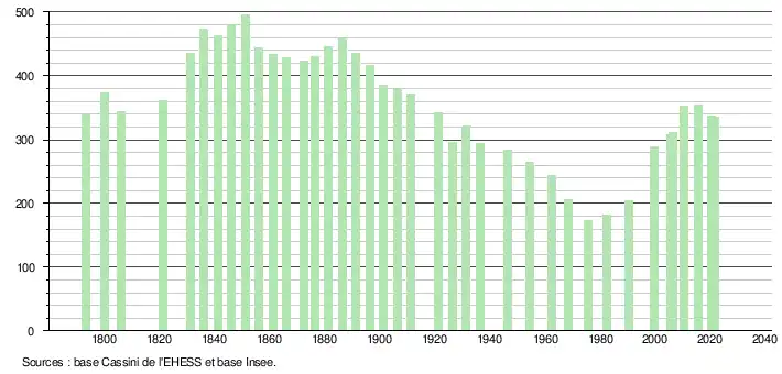 L'évolution du nombre d'habitants est connue à travers les recensements de la population effectués dans la commune depuis 1793. Pour les communes de moins de 10 000 habitants, une enquête de recensement portant sur toute la population est réalisée tous les cinq ans, les populations légales des années intermédiaires étant quant à elles estimées par interpolation ou extrapolation[21]. Pour la commune, le premier recensement exhaustif entrant dans le cadre du nouveau dispositif a été réalisé en 2005[22].