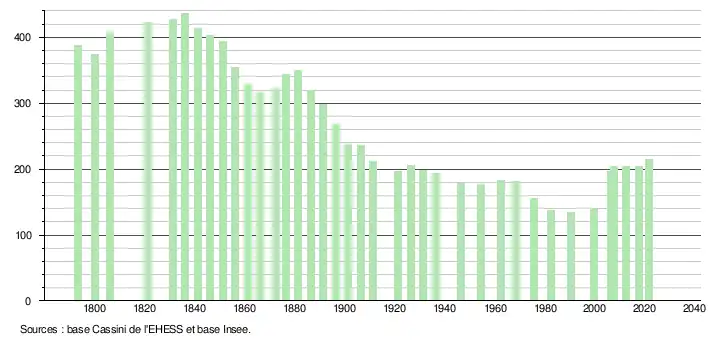 L'évolution du nombre d'habitants est connue à travers les recensements de la population effectués dans la commune depuis 1793. Pour les communes de moins de 10 000 habitants, une enquête de recensement portant sur toute la population est réalisée tous les cinq ans, les populations légales des années intermédiaires étant quant à elles estimées par interpolation ou extrapolation[20]. Pour la commune, le premier recensement exhaustif entrant dans le cadre du nouveau dispositif a été réalisé en 2007[21].