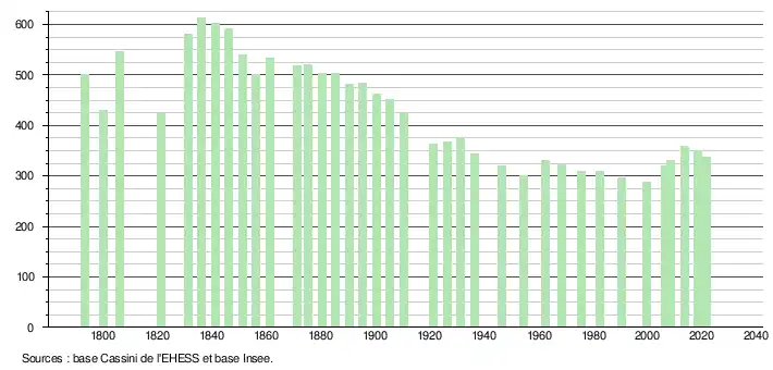L'évolution du nombre d'habitants est connue à travers les recensements de la population effectués dans la commune depuis 1793. Pour les communes de moins de 10 000 habitants, une enquête de recensement portant sur toute la population est réalisée tous les cinq ans, les populations légales des années intermédiaires étant quant à elles estimées par interpolation ou extrapolation[26]. Pour la commune, le premier recensement exhaustif entrant dans le cadre du nouveau dispositif a été réalisé en 2008[27].