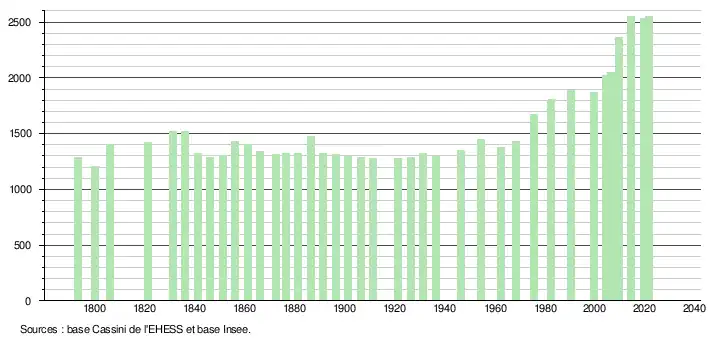L'évolution du nombre d'habitants est connue à travers les recensements de la population effectués dans la commune depuis 1793. Pour les communes de moins de 10 000 habitants, une enquête de recensement portant sur toute la population est réalisée tous les cinq ans, les populations légales des années intermédiaires étant quant à elles estimées par interpolation ou extrapolation[26]. Pour la commune, le premier recensement exhaustif entrant dans le cadre du nouveau dispositif a été réalisé en 2004[27].