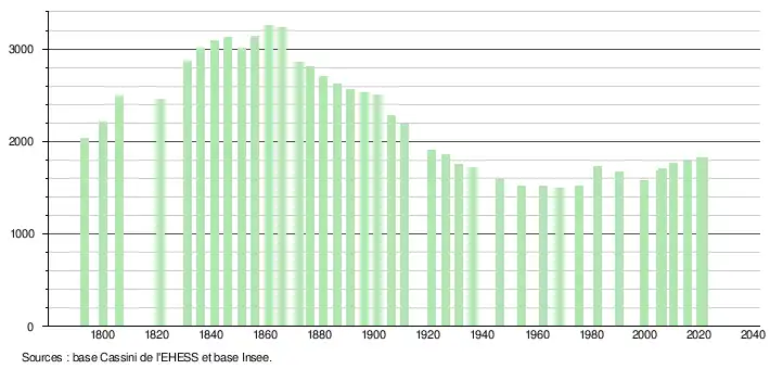 L'évolution du nombre d'habitants est connue à travers les recensements de la population effectués dans la commune depuis 1793. Pour les communes de moins de 10 000 habitants, une enquête de recensement portant sur toute la population est réalisée tous les cinq ans, les populations légales des années intermédiaires étant quant à elles estimées par interpolation ou extrapolation[18]. Pour la commune, le premier recensement exhaustif entrant dans le cadre du nouveau dispositif a été réalisé en 2005[19].