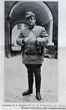Tabourine est envoyé par le journal Niva comme photoreporter et correspondant de guerre sur le front d'Extrême-Orient, où son frère Guéorgui se trouve déjà en qualité de capitaine au 35e régiment de tirailleurs de Sibérie-Orientale[2]. Il côtoie d'autres photographes fameux comme Victor Bulla (fils de Karl Bulla) ou Piotr Otsoup, et parcourt le théâtre d'opérations jusqu'en Mandchourie. Son emploi est très varié: il écrit aussi bien des reportages au ton presque littéraire, qu'il ne dessine des croquis ou des scènes de bataille ou bien n'envoie à la rédaction de Saint-Pétersbourg des photographies de la Chine du nord qui sont considérées comme extrêmement exotiques par le public russe de cette époque. À partir de l'été 1904, il publie dans presque tous les numéros de l'hebdomadaire à grand tirage[3] des reportages et des comptes rendus des événements de la guerre, accompagnés de dessins et de clichés photographiques.