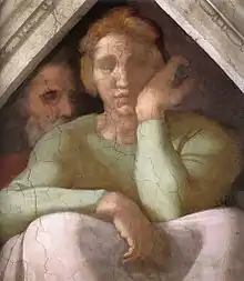 La mère de Jesse occupe tout le premier plan et regarde de face vers l'extérieur, dans une pose d'immobilité absolue. Les jambes sont pliées et séparées, les pieds entrelacés et recouverts d'un manteau violet ; elle porte au niveau du buste une robe verte serrée qui révèle une musculature masculine, typique des femmes de Michel-Ange. Une main repose sur ses jambes et une autre touche le visage avec son dos, rehaussant le regard énigmatique.