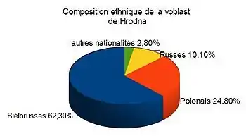 Les Biélorusses représentent 62,3 % de la population. La région compte de nombreuses minorités, dont les Polonais (24,8 %), les Russes (10 %), les Ukrainiens (1,8 %) ainsi que des Tatars, des Lituaniens et d'autres nationalités.