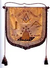 - Bannière : Étendard caractérisant une loge. Peuvent être brodés sur une bannière, l'année de naissance de la loge (selon le calendrier maçonnique), son nom, son numéro d'ordre dans la chronologie de l'obédience, sa devise ainsi que les symboles adoptés par la loge. Les bannières sont entre autres utilisées lors de manifestations nationales et régionales.