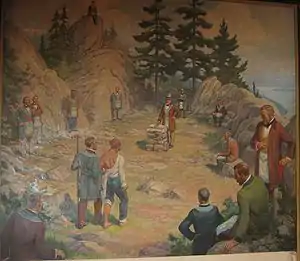 - Chambre du milieu : Lieu symbolique exclusivement réservé au titulaire du grade de maître. L'expression parait dans les plus anciens rituels du grade de maître. La notion de « milieu » fut largement définie par de nombreux auteurs qui voient dans cette notion, l'aboutissement où se rencontrent ceux qui ont su approfondir leurs connaissances[28]. Selon certains rites comme le Rite écossais ancien et accepté, lors du passage du grade de compagnon à celui de maître, au 3e degré maçonnique, le temple devient la chambre du milieu ou hekhal, là où, selon le mythe d'Hiram, les maîtres recevaient leur salaire.