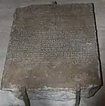 Inscription latine AE 2006, 0789 d'époque romaine découverte à Saillans (Drôme) et élevée par la cité des Voconces en l'honneur d'un de ses notables. | |