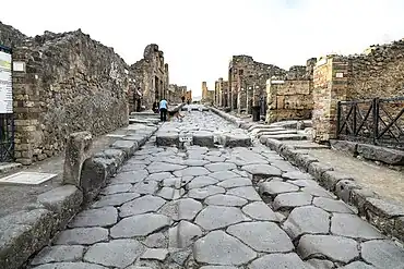 Une rue urbaine s'appelle vicus, mot qui signifie aussi quartier d'habitation, village[37]. La terminologie antique sur les rues est foisonnante : actus (voie à simple circulation), angiportus (ruelle tortueuse), cardo et decumanus, clivus (rue en pente), iter (chemin pour piéton) , limes (chemin de lisière), via (voie pour deux chars de front)[38].