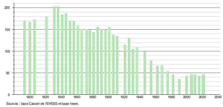 L'évolution du nombre d'habitants est connue à travers les recensements de la population effectués dans la commune depuis 1793. Pour les communes de moins de 10 000 habitants, une enquête de recensement portant sur toute la population est réalisée tous les cinq ans, les populations légales des années intermédiaires étant quant à elles estimées par interpolation ou extrapolation[19]. Pour la commune, le premier recensement exhaustif entrant dans le cadre du nouveau dispositif a été réalisé en 2005[20].