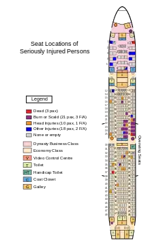 Au total, 219 personnes, y compris des membres d'équipage, ont été admises à l'hôpital, dont 50 ont été grièvement blessées et 153 ont subi des blessures mineures. Les 15 membres d'équipage ont survécu.