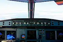 Le cockpit d'un Airbus A320. Les dix boutons de commande sont affichés. Le bouton de vitesse verticale et le bouton d'altitude sont situés l'un à côté de l'autre et ont une conception similaire. Cela pourrait avoir conduit à la confusion[1].